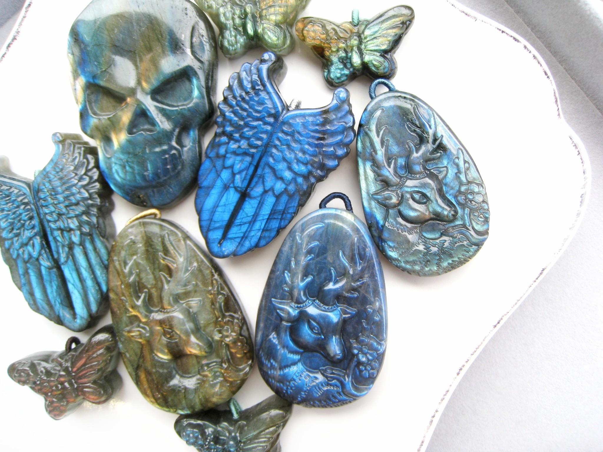 《晶格格的多寶格》收藏級!天然加拿大全滿強光藍彩拉長石精緻小鹿/骷髏頭/小花蝴蝶/夢幻天使之翼吊墜【RF147-】