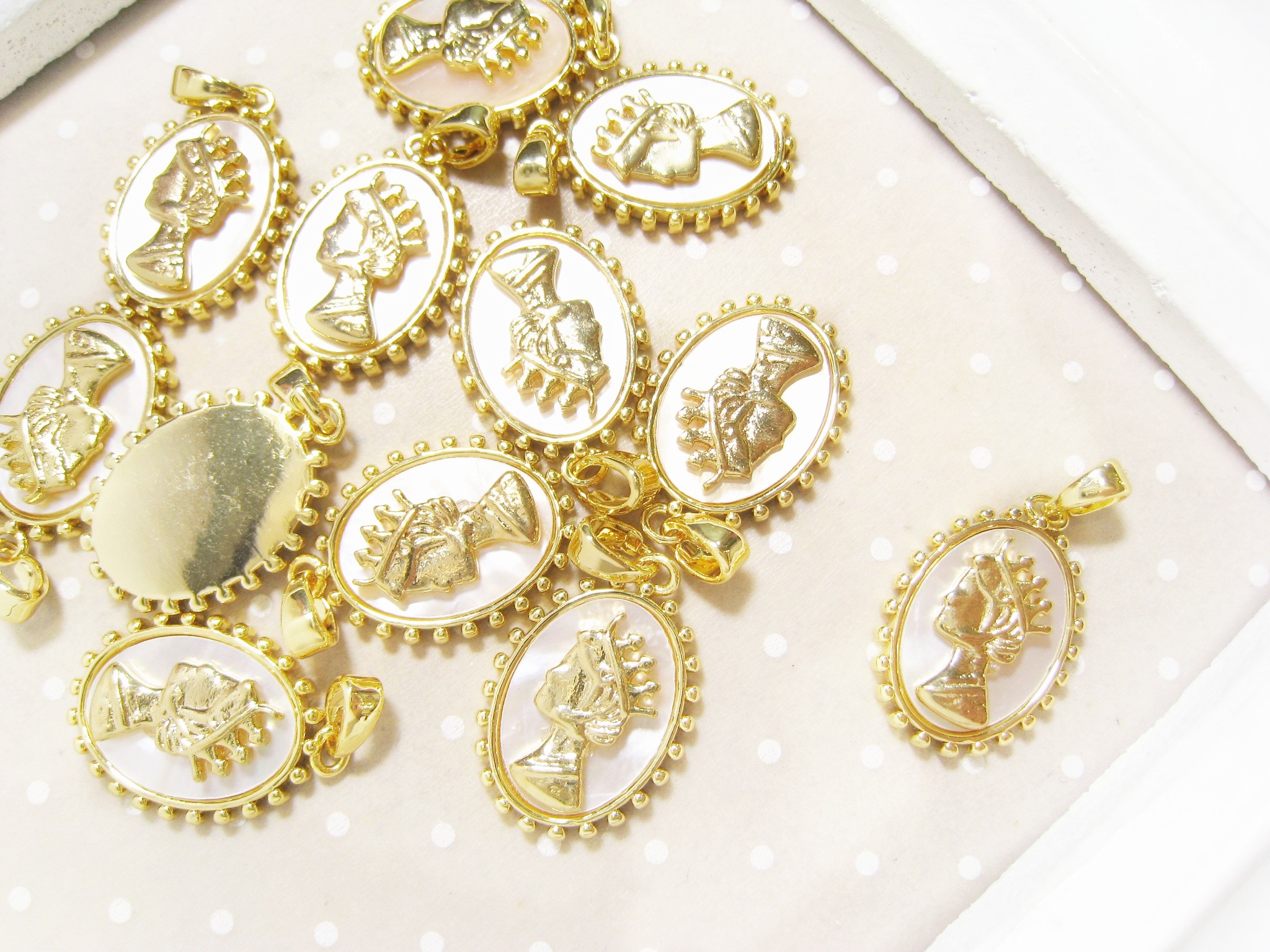 《晶格格的多寶格》天然白蝶貝銅鍍14K金包鑲幸運草.五角星.鏤空五瓣花.麻花鬱金香.點紋女王頭橢圓吊墜【F6423-】